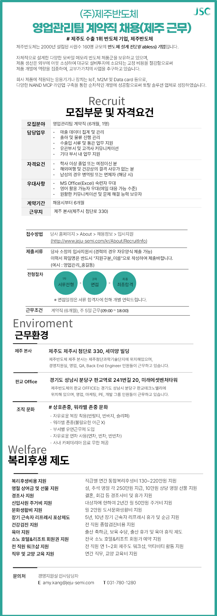 경영지원실 영업관리팀 계약직 채용(제주 근무)